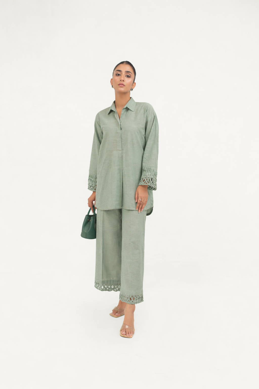 This two-piece grey ensemble is a perfect choice for summer outings, offering a fresh and comfortable look. The top features a classic collar with a box pleat, complemented by full sleeves adorned with delicate pleats and detailing that add subtle texture. Paired with matching wide-leg pants, the outfit creates a cohesive and elegant monochromatic style that is both modern and effortless.
