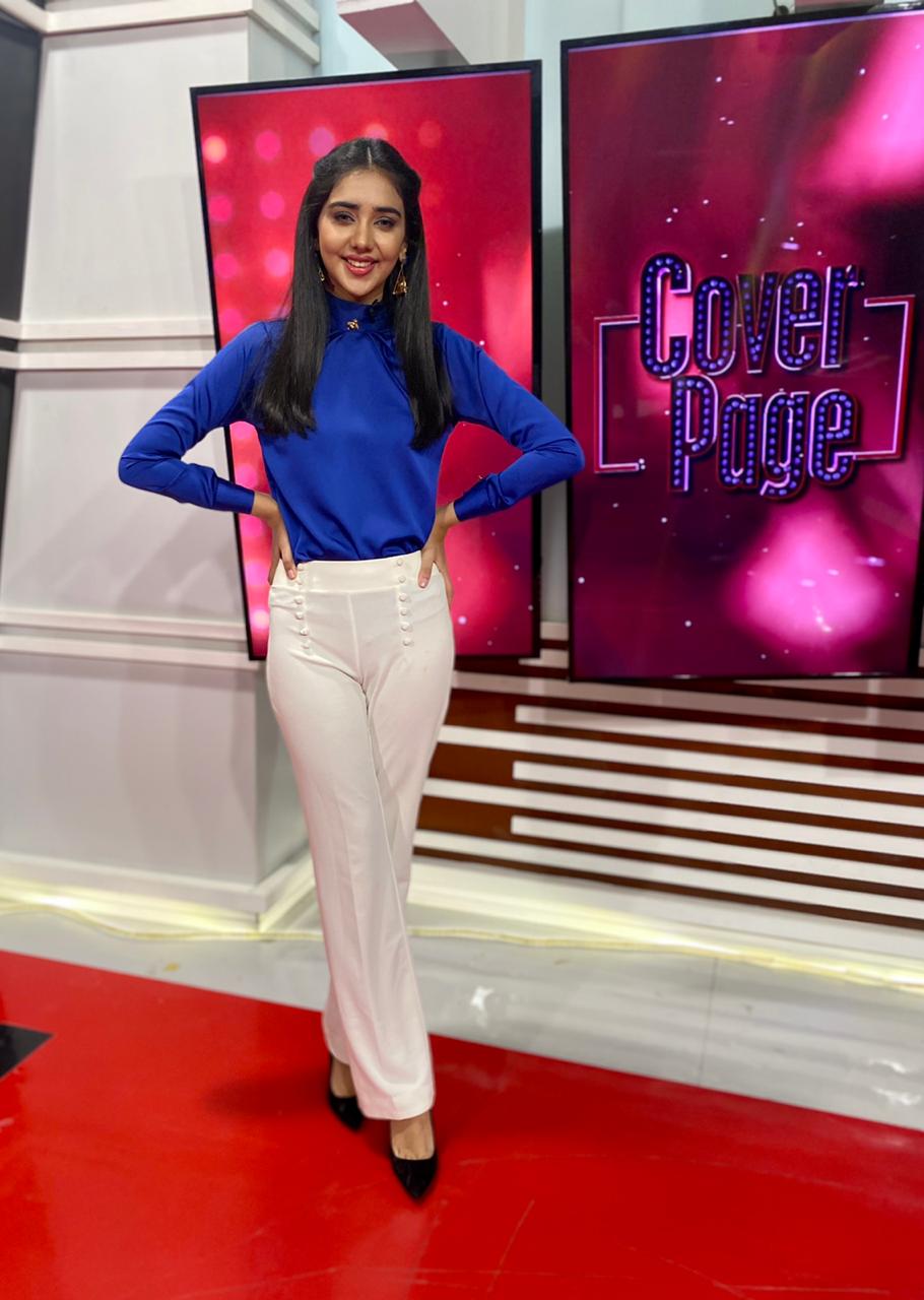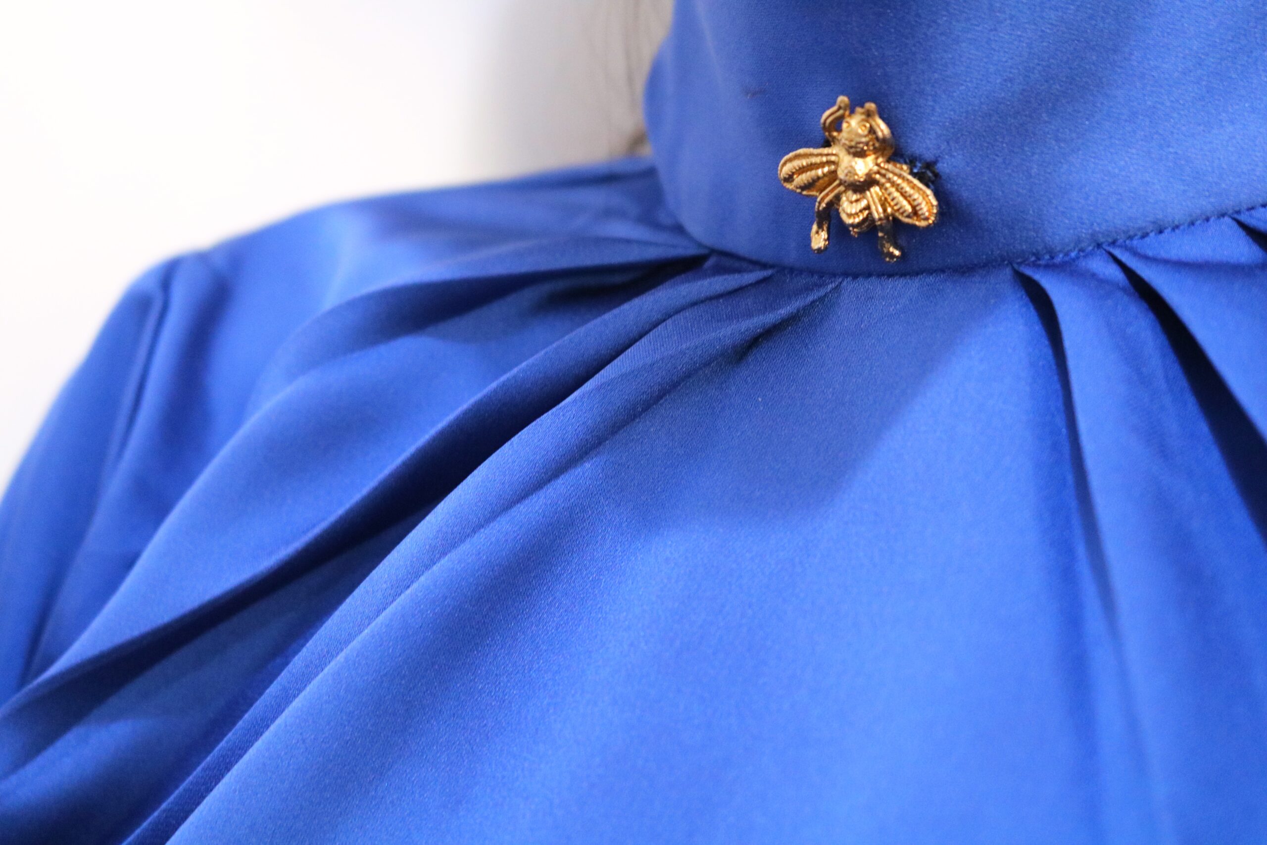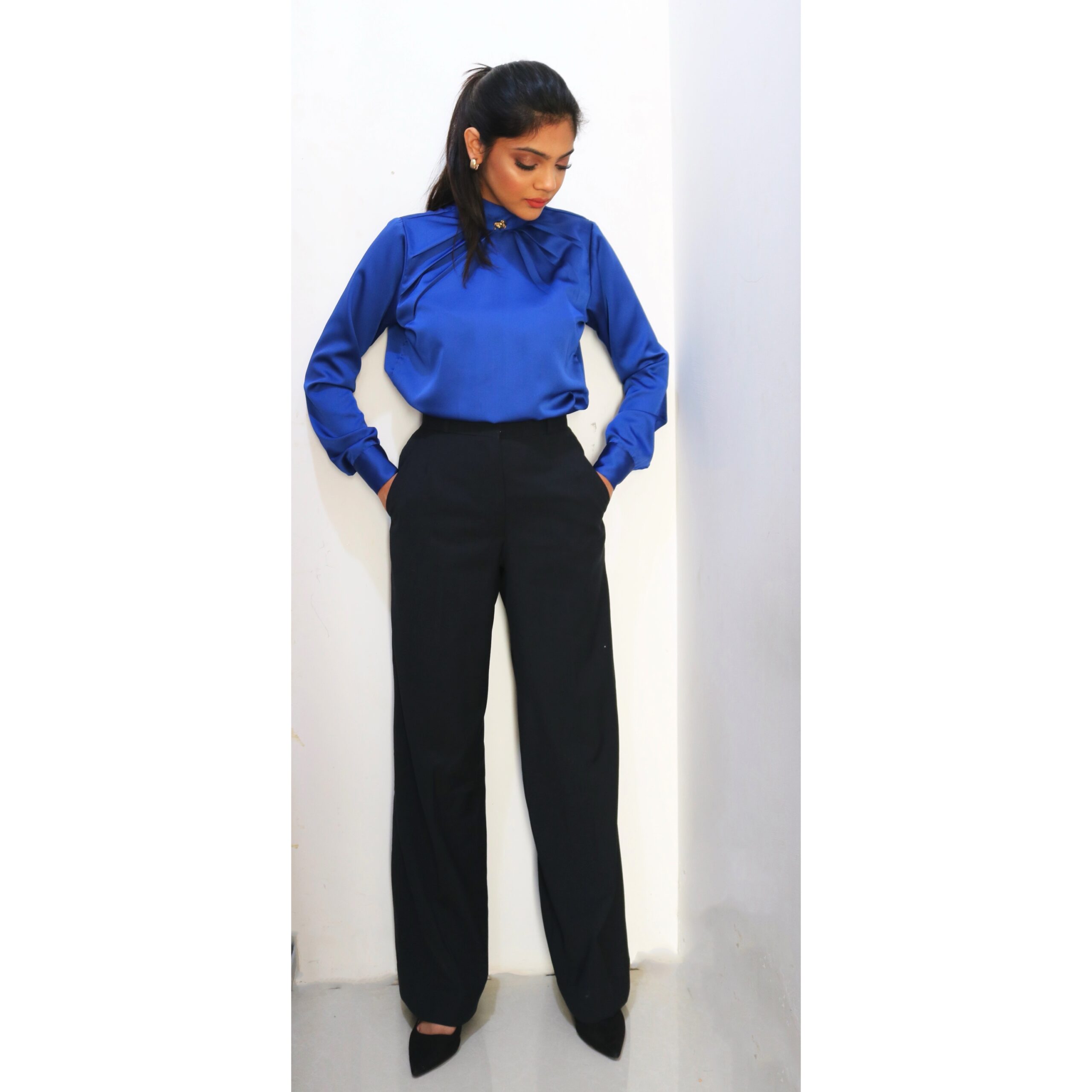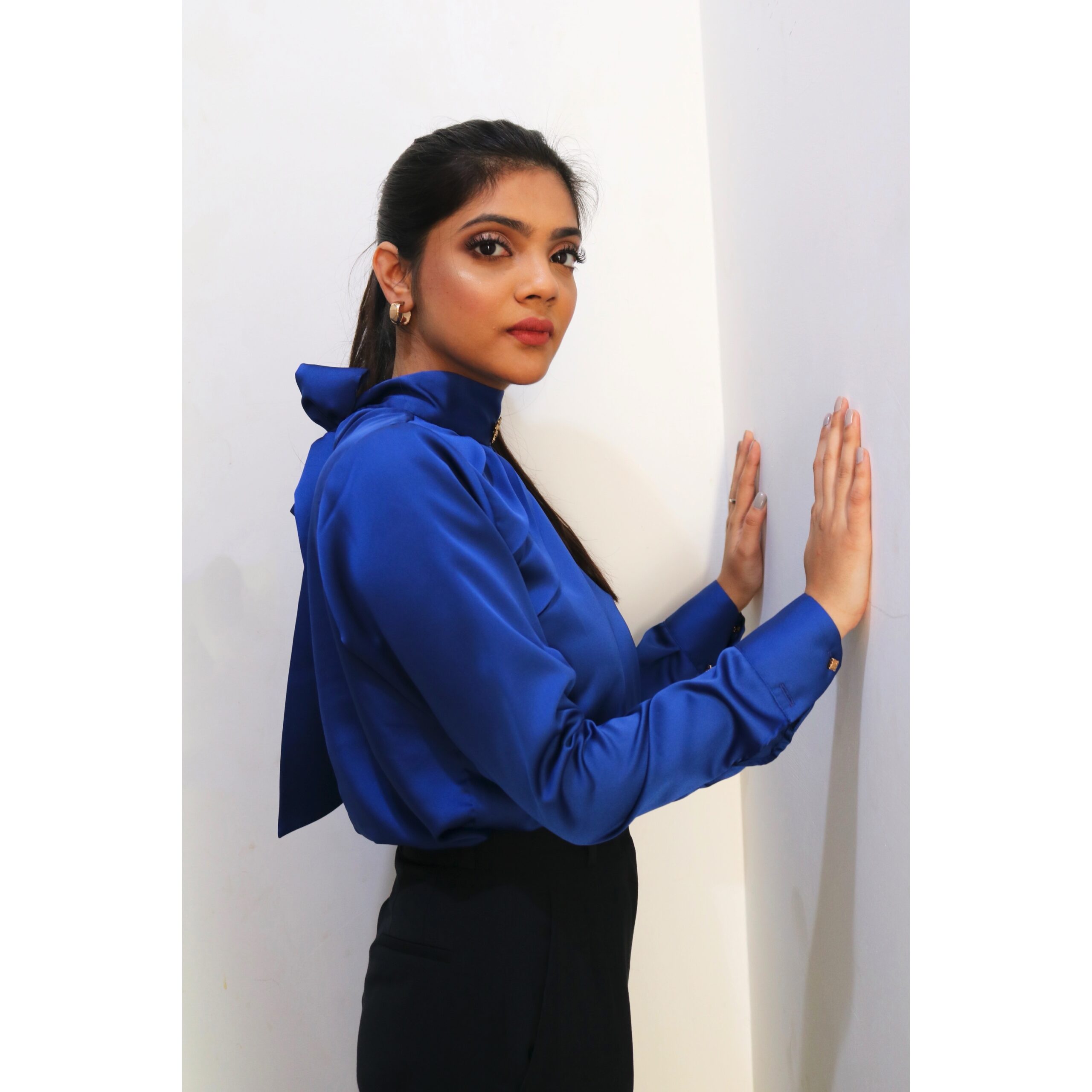 Royal Blue silk high neck top, featuring long sleeves with cuff detailing, delicate front pleats, and a statement tied-back fastening.